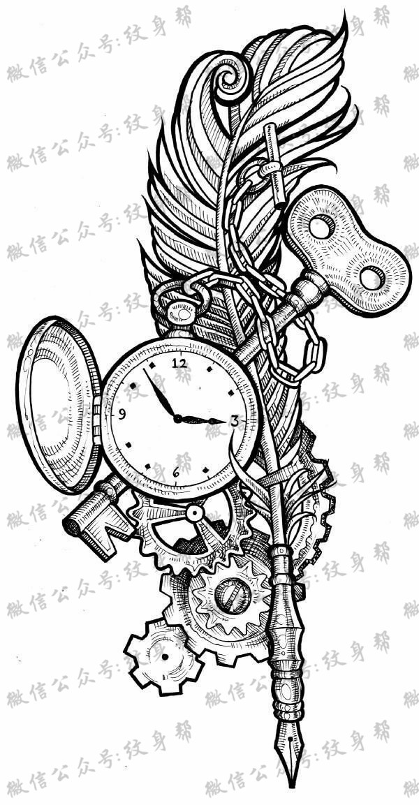 钟表纹身手稿_30张钟表指南针的纹身手稿图案素材图片