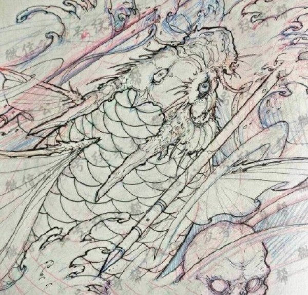一组满背大气九龙拉棺纹身图案作品和手稿