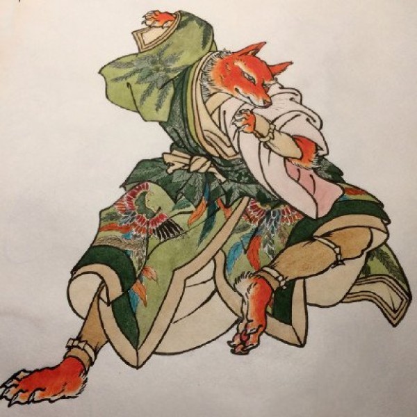 几张日式风格衣着华丽的狐狸纹身手稿图