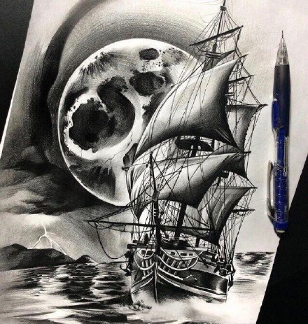 帆船素材--一组适合纹身的帆船纹身手稿素材图案