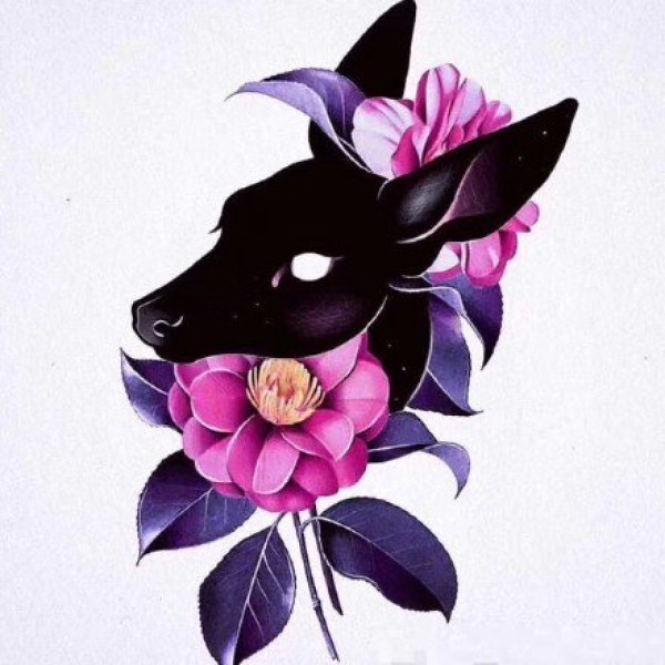 粉黑色的花朵和动物组成的纹身手稿图案