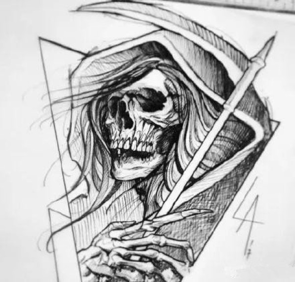 创意十足的几何+骷髅的黑色线稿纹身手稿图案