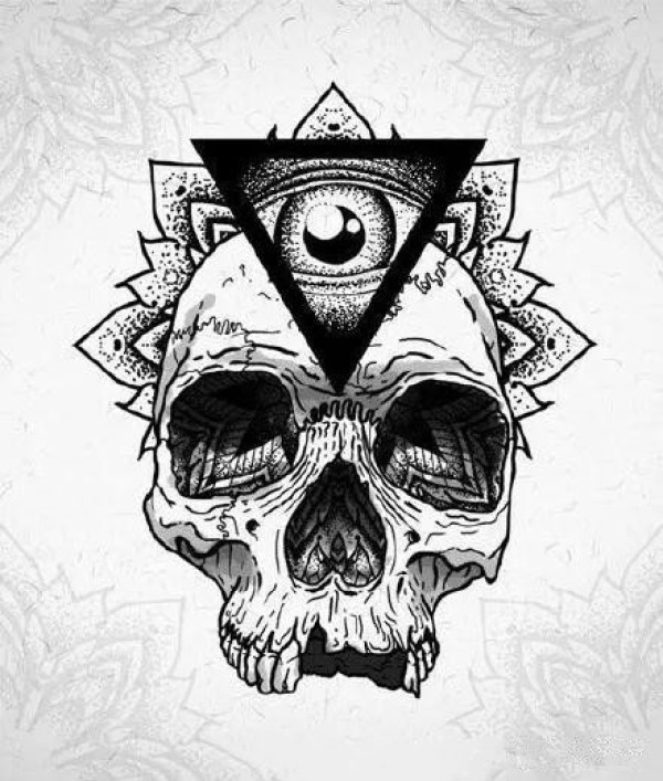 创意十足的几何+骷髅的黑色线稿纹身手稿图案