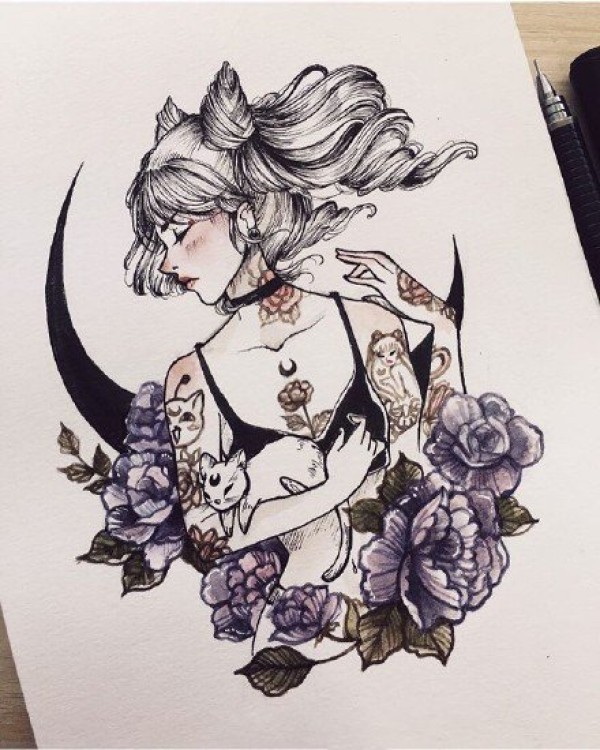 二次元漫画风格的女生美女纹身手稿图案