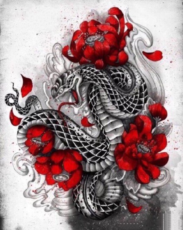 蟒蛇盘牡丹花的线稿纹身手稿图案8张