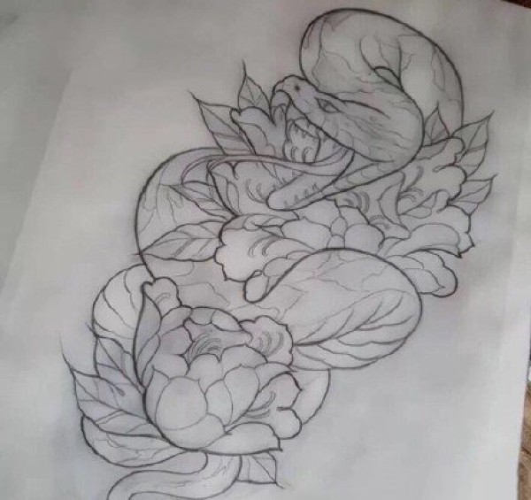 蟒蛇盘牡丹花的线稿纹身手稿图案8张