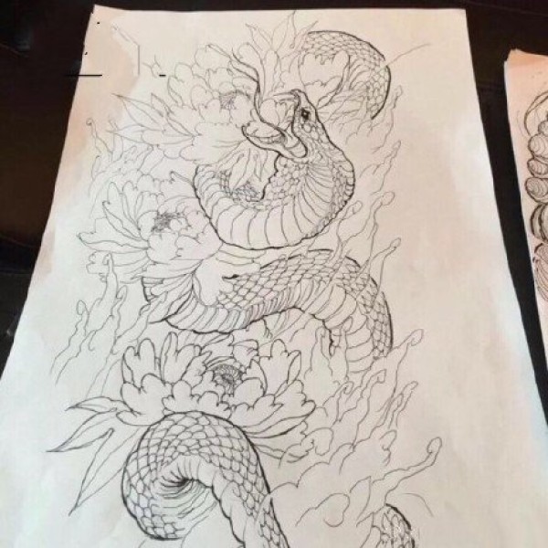 蟒蛇盘牡丹花的线稿纹身手稿图案8张