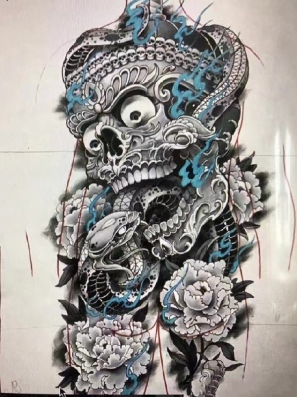 一组满背大气九龙拉棺纹身图案作品和手稿