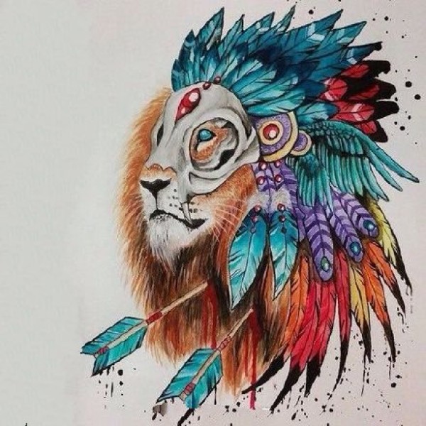结合印第安部落元素的动物狼和狮子等纹身手稿图案