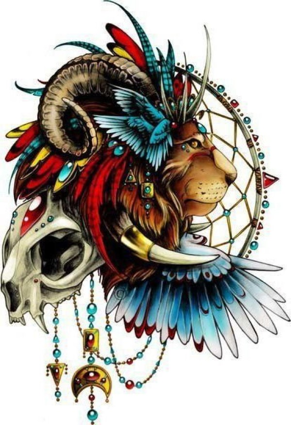 结合印第安部落元素的动物狼和狮子等纹身手稿图案