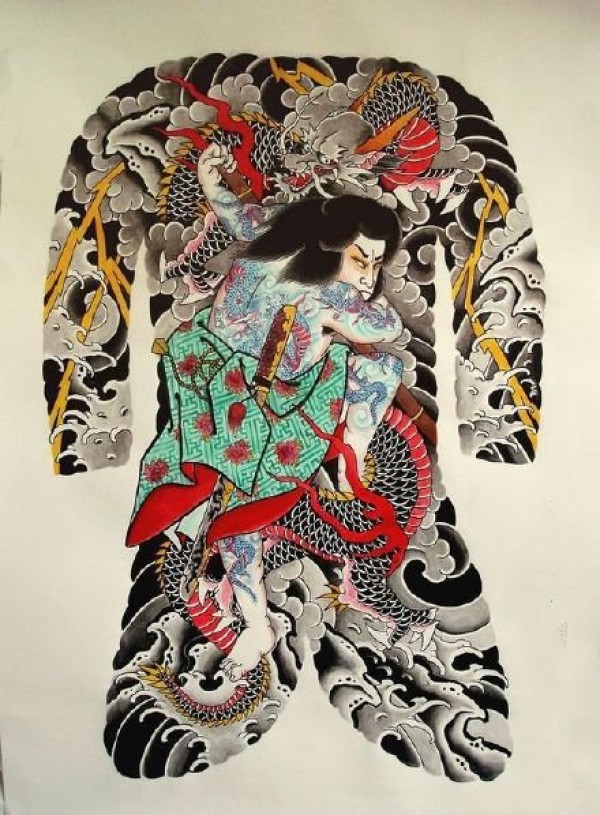 一组满背大气九龙拉棺纹身图案作品和手稿