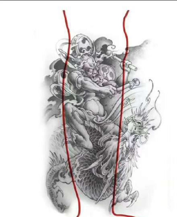 一组满背大气九龙拉棺纹身图案作品和手稿