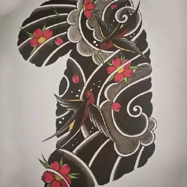 老传统半甲的樱花牡丹等花卉半胛纹身手稿
