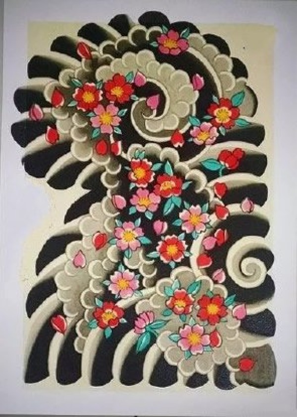 老传统半甲的樱花牡丹等花卉半胛纹身手稿