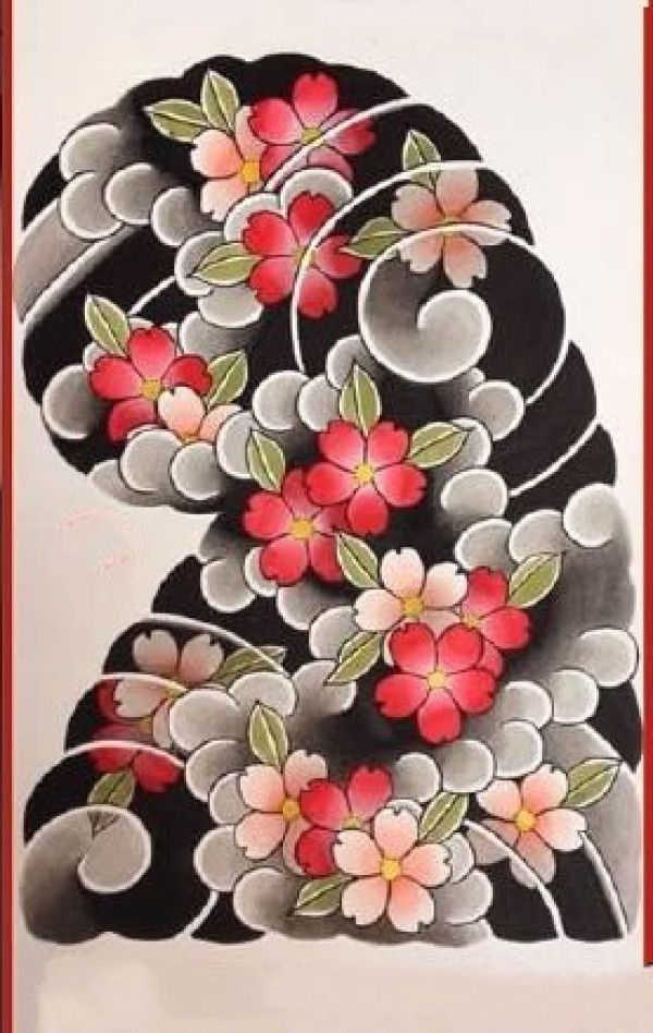 老传统半甲的樱花牡丹等花卉半胛纹身手稿