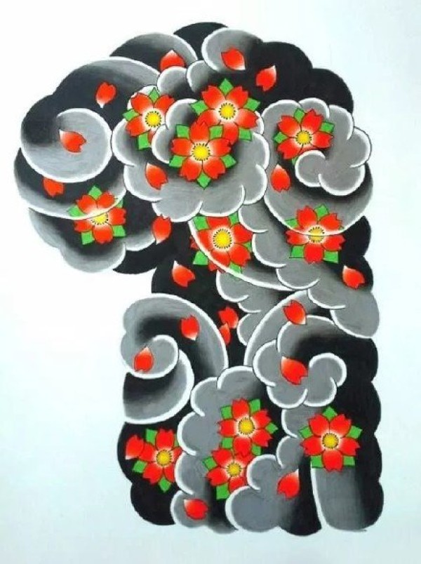 老传统半甲的樱花牡丹等花卉半胛纹身手稿