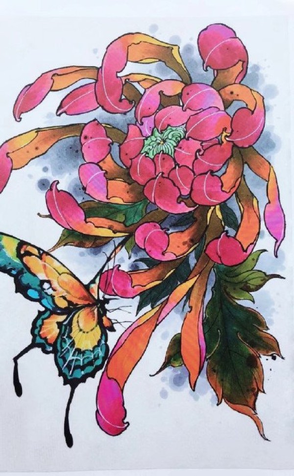 传统花卉:22张牡丹等传统花卉彩色纹身手稿