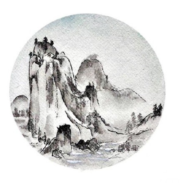 一组圆图形中的水墨山水画纹身手稿