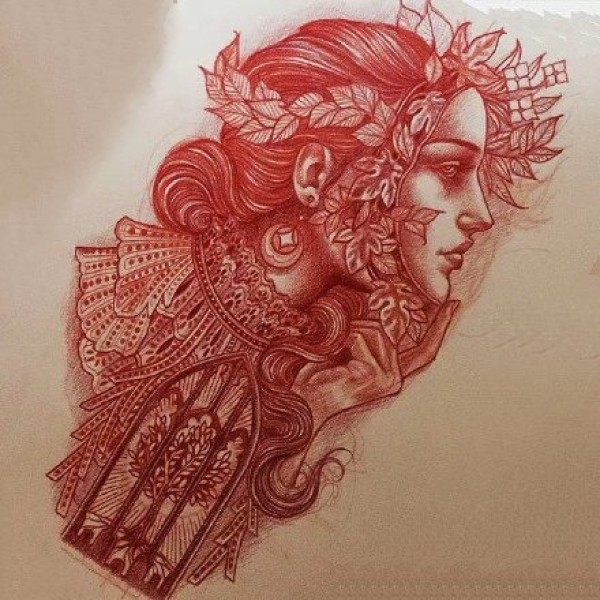 红色调的一组欧美女郎纹身手稿