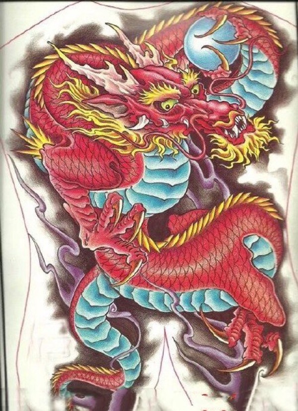 一组满背大气九龙拉棺纹身图案作品和手稿