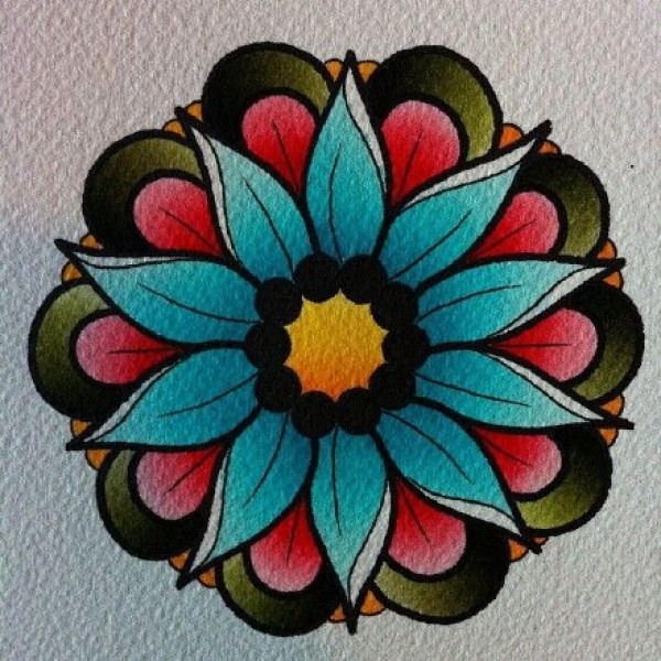oldschool风格的彩色花卉曼达拉纹身手稿