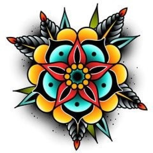 oldschool风格的彩色花卉曼达拉纹身手稿