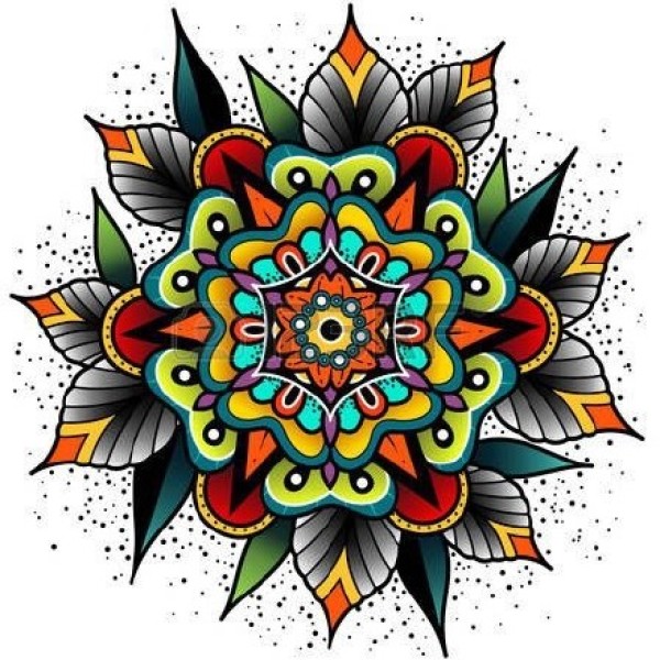 oldschool风格的彩色花卉曼达拉纹身手稿