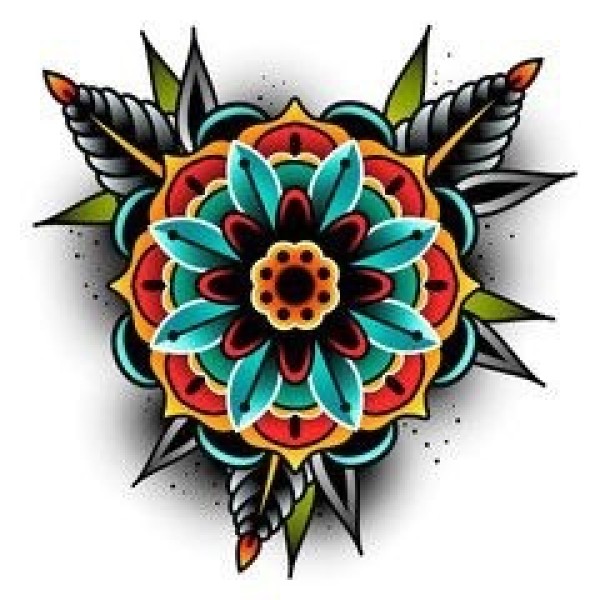 oldschool风格的彩色花卉曼达拉纹身手稿