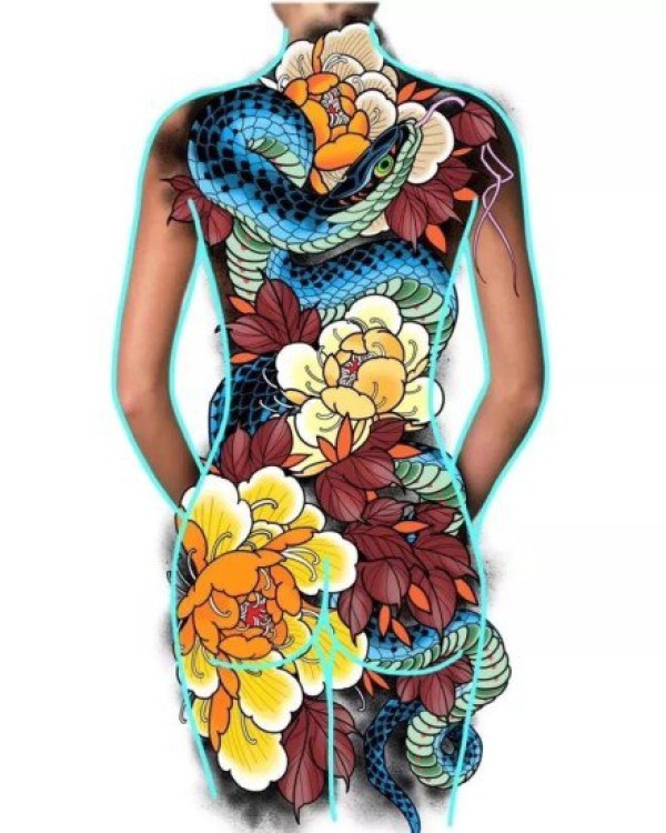 一组满背大气九龙拉棺纹身图案作品和手稿
