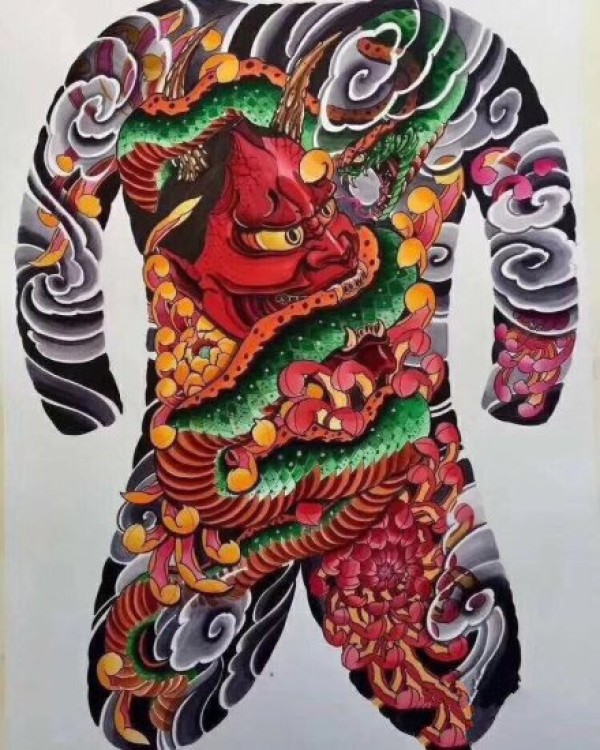一组满背大气九龙拉棺纹身图案作品和手稿