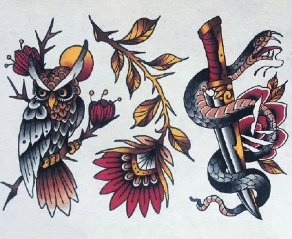 38组黄红色调的school彩图纹身手稿图案