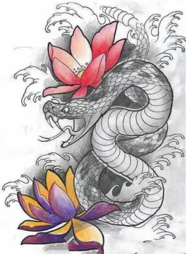 9张蛇盘牡丹的纹身手稿图片