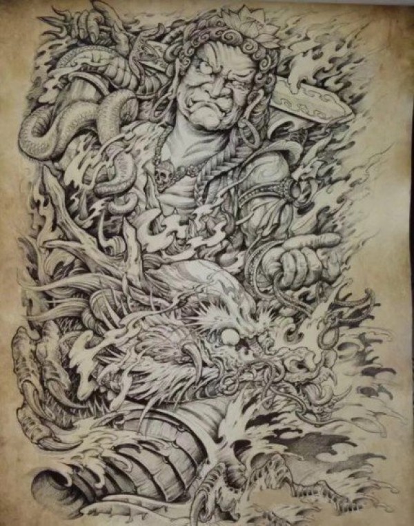 一组满背大气九龙拉棺纹身图案作品和手稿