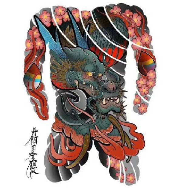 一组满背大气九龙拉棺纹身图案作品和手稿