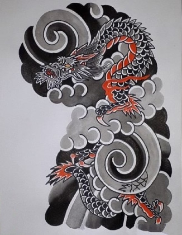 一组满背大气九龙拉棺纹身图案作品和手稿