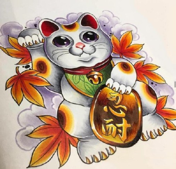 一组彩色招财猫的纹身手稿图片欣赏