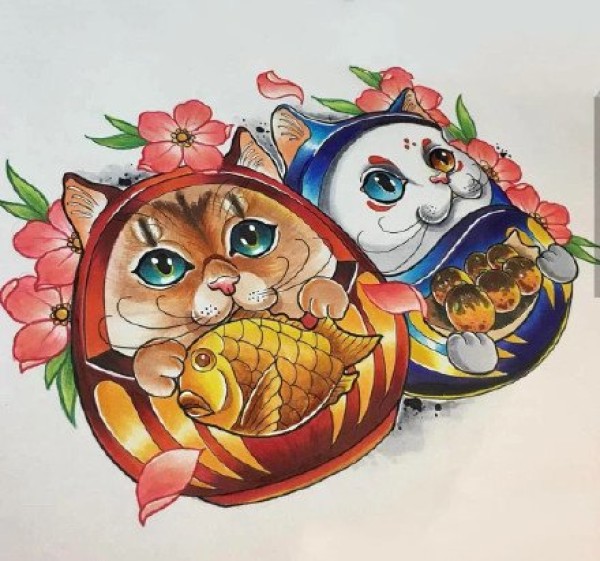 一组彩色招财猫的纹身手稿图片欣赏