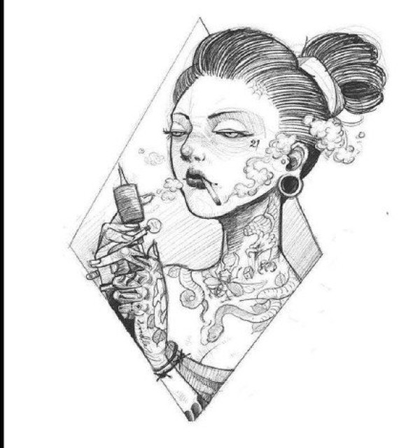 一组酷酷的艺妓女郎人物创意纹身手稿图片
