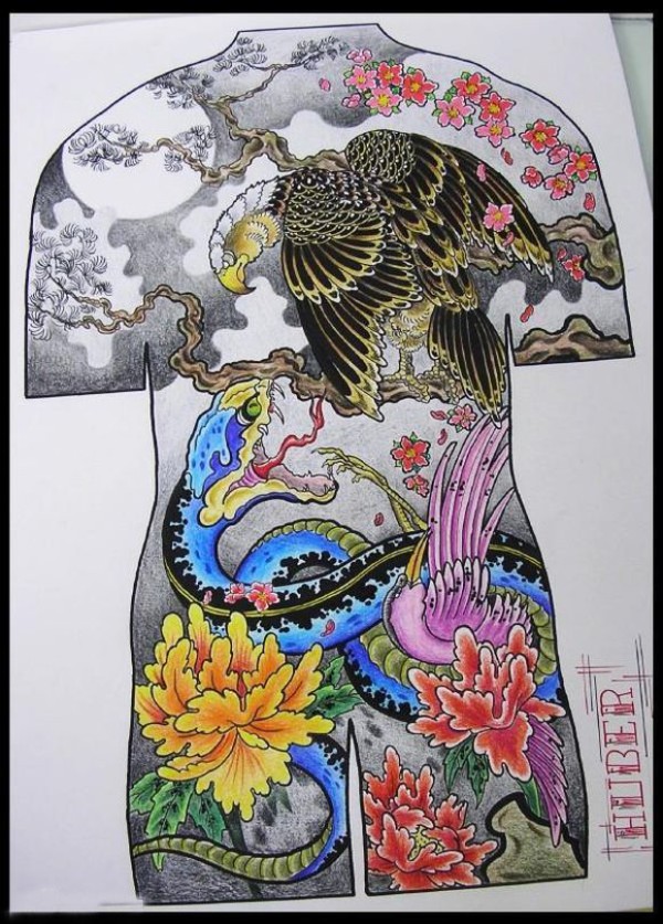 一组满背大气九龙拉棺纹身图案作品和手稿