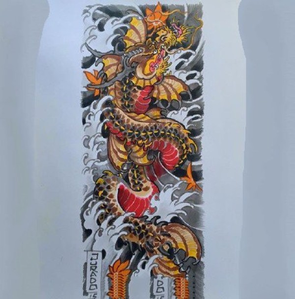 一组满背大气九龙拉棺纹身图案作品和手稿