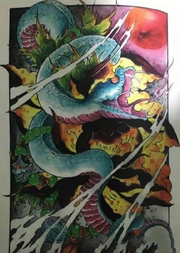 一组满背大气九龙拉棺纹身图案作品和手稿