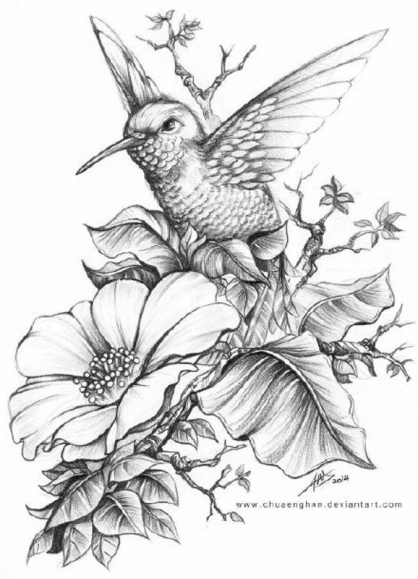 一组很美的黑灰色鸟与花朵搭配的纹身手稿图片
