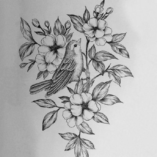 一组很美的黑灰色鸟与花朵搭配的纹身手稿图片