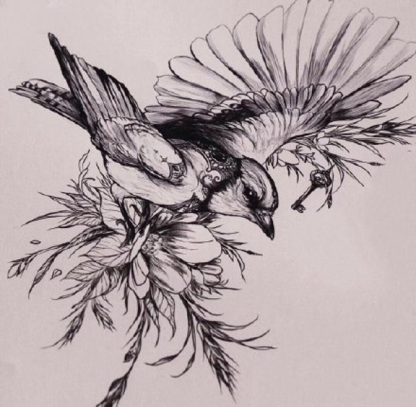 一组很美的黑灰色鸟与花朵搭配的纹身手稿图片