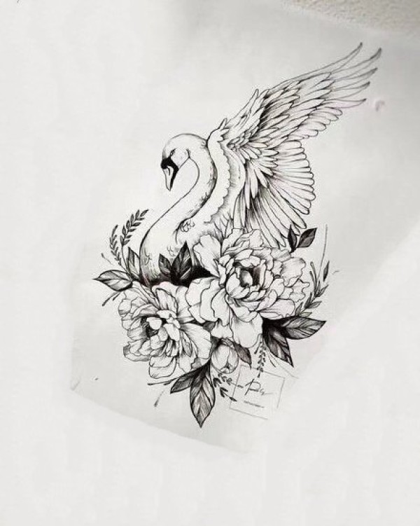 一组很美的黑灰色鸟与花朵搭配的纹身手稿图片