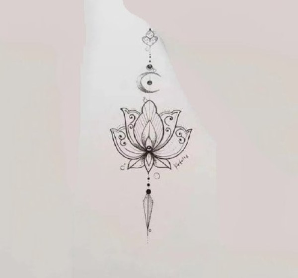 适合脊柱处纹的荷花莲花纹身图片手稿