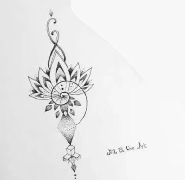 适合脊柱处纹的荷花莲花纹身图片手稿