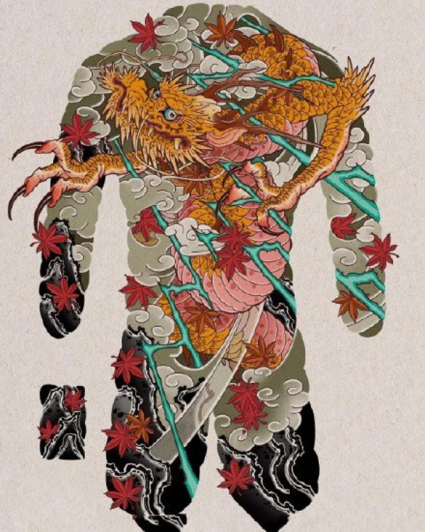 一组满背大气九龙拉棺纹身图案作品和手稿