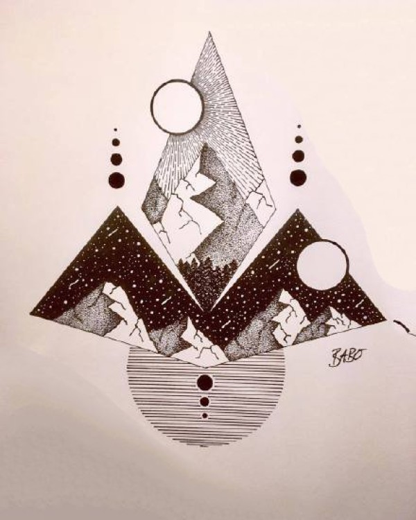 一组融合了几何和风景元素的点刺纹身手稿图案
