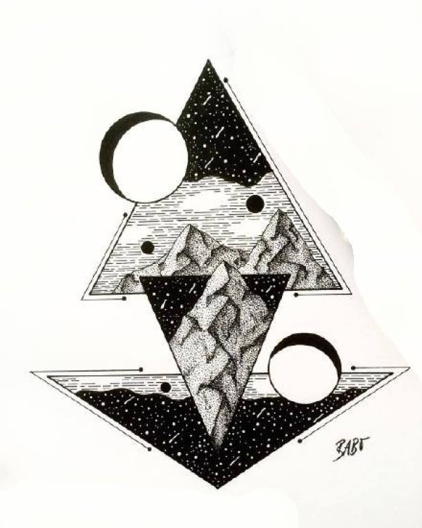 一组融合了几何和风景元素的点刺纹身手稿图案